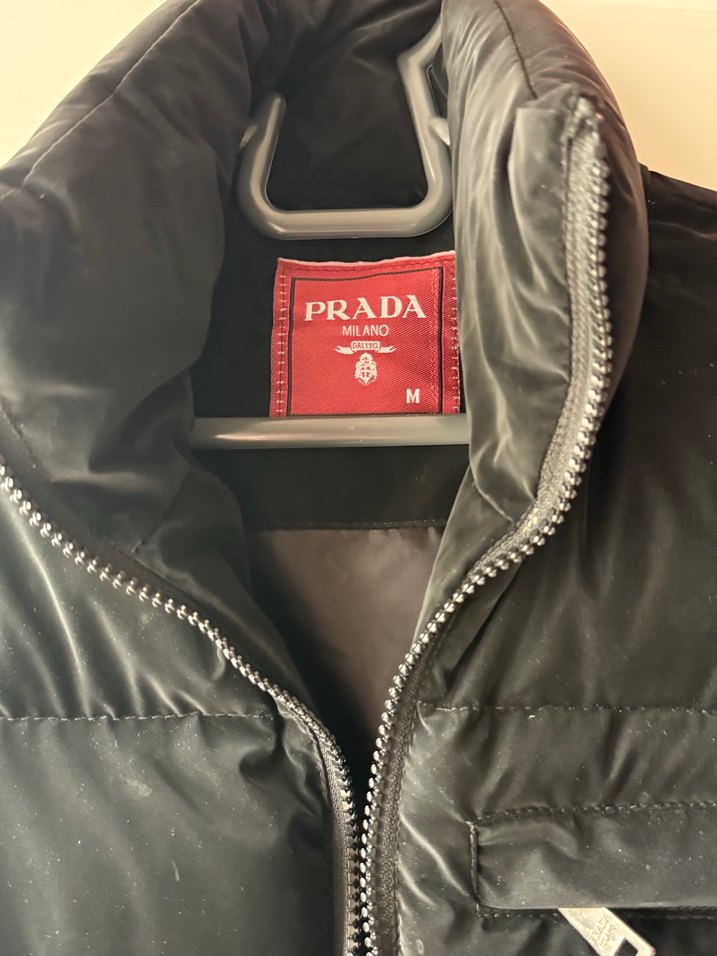 Prada marka siyah renk, fermuarlı ve uzun kollu, bisiklet yaka, rahat kesim erkek mont. Sokak stili ve günlük kullanım için uygundur.