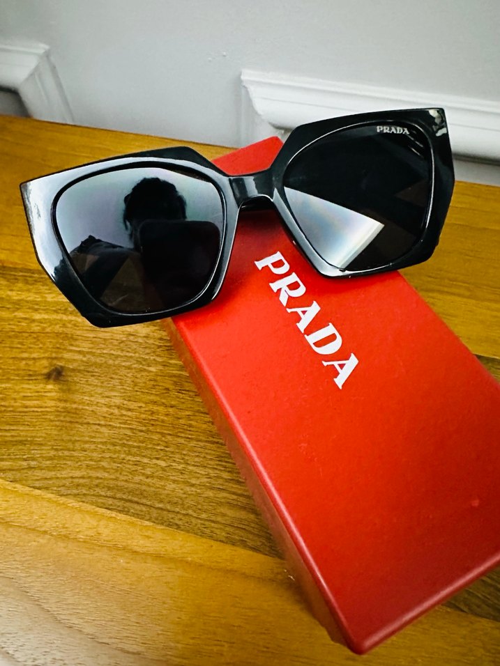 Prada markalı, kadın güneş gözlüğü. Koyu renk camlarıyla şık ve fonksiyonel. Prada kutu hediyeli