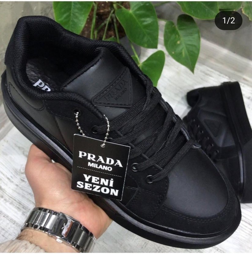 Prada siyah kadın spor ayakkabısı, baskılı detaylı ve velcro özellikli. Günlük sokak stili için düz taban kauçuk tabanlı. PRADA, SEZON, MILANO, YENi ibareli.
