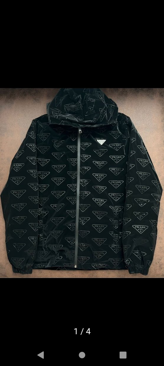 Prada marka siyah kapüşonlu, fermuarlı ve uzun kollu ceket. Sentetik kumaştan, dar kesim ve sokak modasına uygun desenli tasarım.