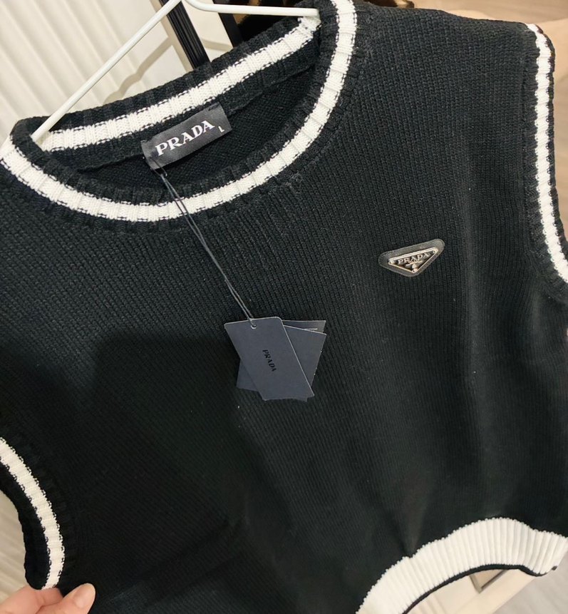 Siyah renkli, kısa kollu, kısa boy triko kazak. Beyaz şerit detayları ve Prada logosu bulunur. Günlük rahat sokak stili için uygundur.