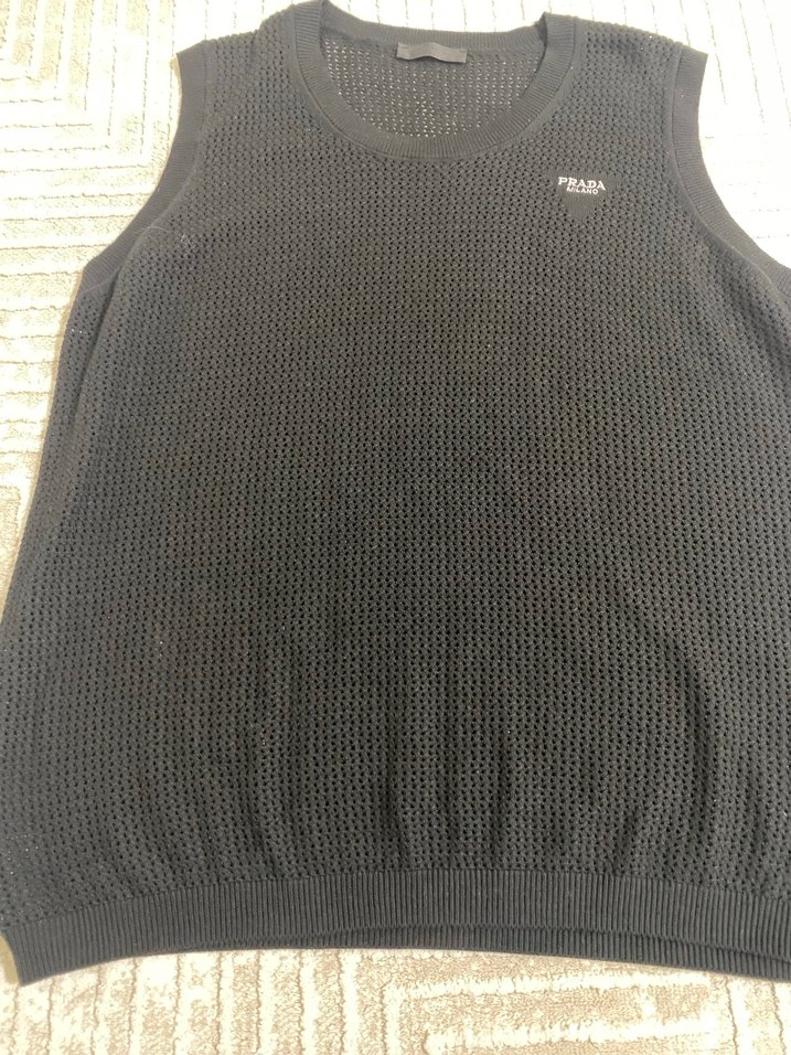Prada marka, siyah renkli, kolsuz, örgü triko süveter. Normal boyda, bisiklet yaka ve dar kesim, günlük sokak modasına uygun.