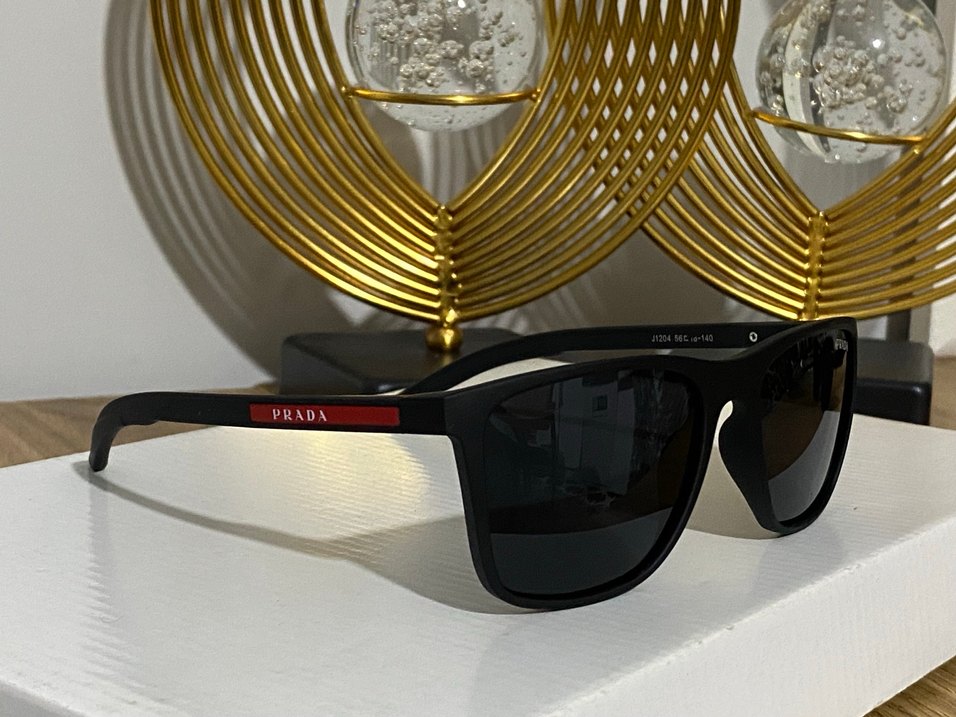 Parlak siyah Prada güneş gözlüğü, klasik streetwear tarzında ve trend günlük giyim için uygun. Çerçevede Prada logosu bulunur. ️