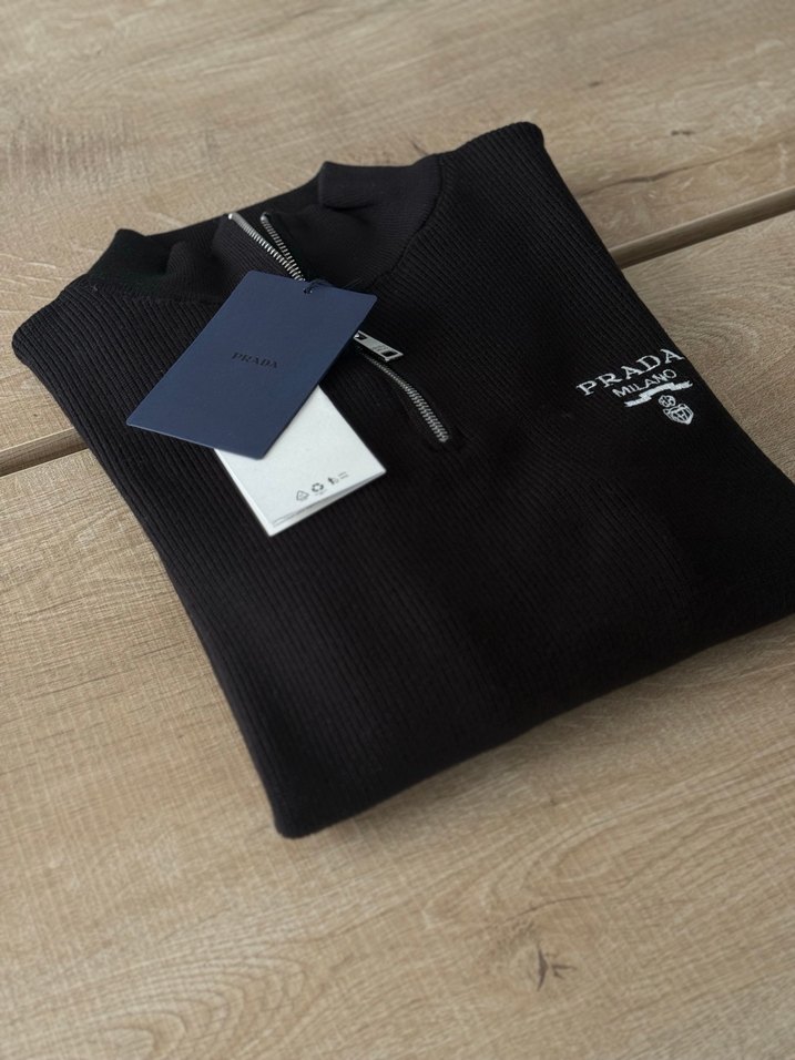 Prada marka siyah renkli, örgü dokulu, fermuarlı yuvarlak yaka uzun kollu polo tişört. Pamuklu kumaştan üretilmiş, normal kesim ve günlük kullanım için uygundur.