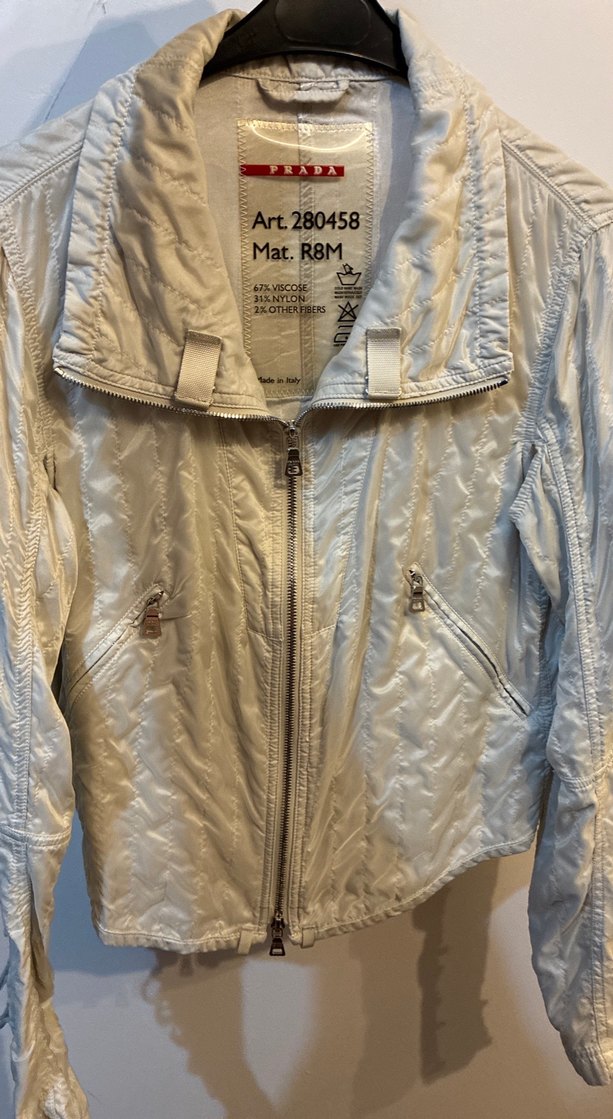SS03' Prada Sport High Neck Lace Jacket - rüzgarlık tarzında bir ceket. Lace yani dantel denilen tarzı ile ceket kendinden buruşuk gibi özel bir kumaştır. Renk: rengi ışığa göre çok değişiklşk göstermekte, kırık beyaz, krem, çok açık gri tonları arasında değişiyor, ama kırık beyaz denebilir. Beden: 40 beden, ancak italyan kalıpları dar olduğu için 38 bedene kişiye uygun, bu nedenle 38 beden olarak giriş yaptım. Kol kenarları bağcıklı, kol altında tasarımsal bir kesik açıklık var. Yakası ister kıvrık, isterse de bağlıkla sıkıştırılıp dik yaka şeklinde giyilmektedir. ORIJINALDİR, sattığım her ürün orijinal kendime aldığım ürünlerdir.