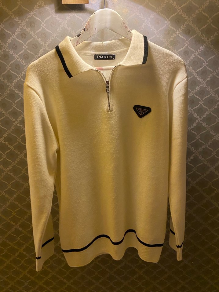 Prada marka, yumuşak dokulu, nakışlı detaylara sahip, bol kesim ve fermuarlı yuvarlak yaka uzun kollu beyaz triko kazak. Siyah detaylı yakası ve manşetleriyle günlük kullanıma uygun Prada yarım fermuarlı yakalı ince kazak M beden 181 71 kiloyum üstüme oturuyor ne dar ne çok bol