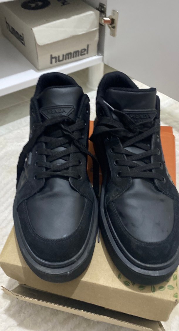 Prada marka siyah erkek spor ayakkabılar, bağcıklı ve kauçuk tabanlıdır. Günlük rahat kullanım için uygun, desen içermeyen şık tasarım.
