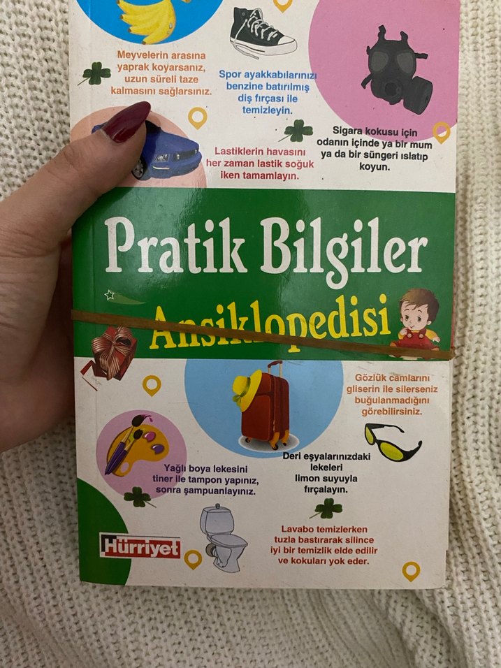 Pratik Bilgiler Ansiklopedisi adlı ilkokul kitabı, meyveleri uzun süre taze tutma, spor ayakkabı temizliği ve sigara kokusunu giderme gibi pratik bilgiler sunar. Günlük yaşam için basit öneriler içerir.