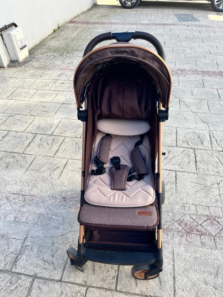 Kahverengi ve gri renklere sahip bebek arabası, yastıklı oturma alanı ve güvenlik kemeri ile rahatlık sunar. Tente ve alt kısmında saklama sepeti bulunur. Puseti ile beraber set olarak satılacaktır. Çok fazla kullanmadık yeni sayılır. Tek el ile rahatça katlanır ve çok hafiftir.