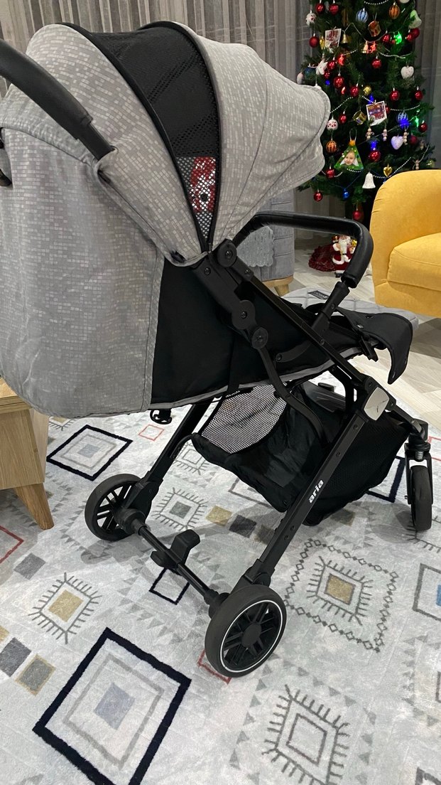 Gri bebek arabası, hafif yapısı ve katlanabilir tasarımı ile dikkat çeker. Konforlu tente ve alt kısmında saklama sepeti bulunur. Çok temizdir bi kusuru eksiği yoktur Yanında yağmurluğu da verilecektir