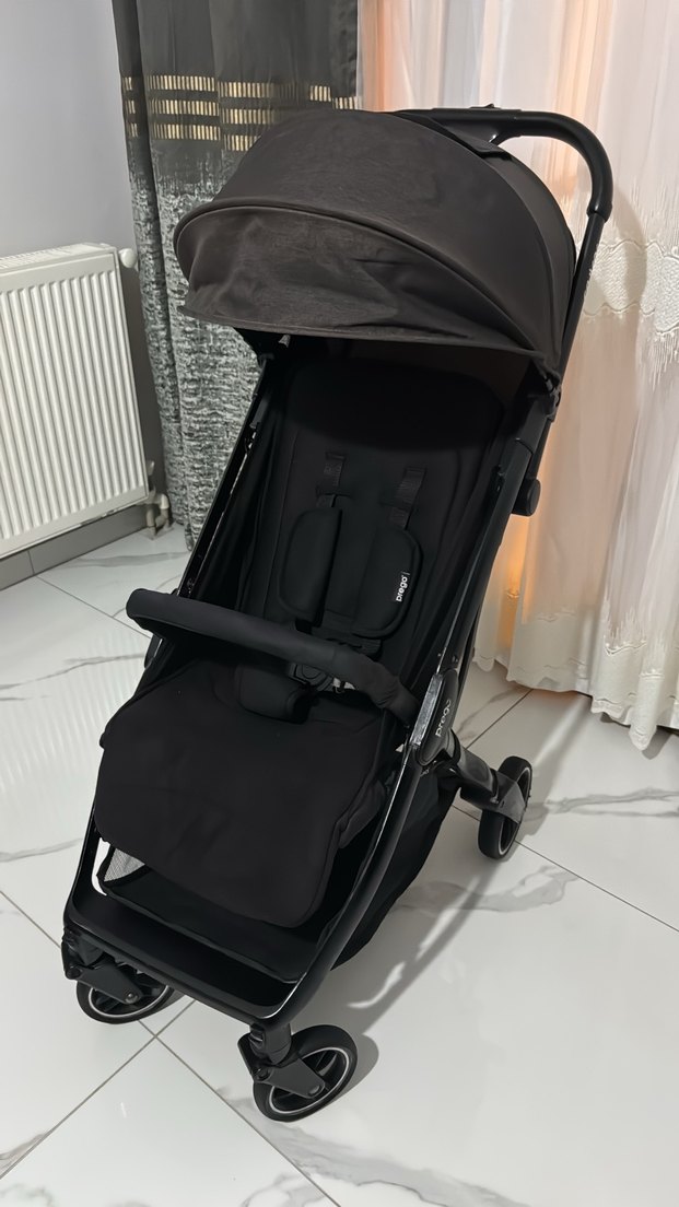 Siyah bebek arabası, güvenlik kemerli yastıklı oturma yeri, ayarlanabilir tente ve sağlam tekerleklerle donatılmıştır.