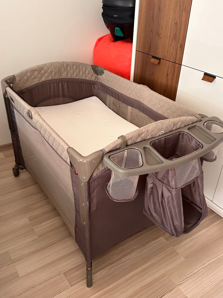 Kahverengi ve gri renklerde, yumuşak yataklı ve çoklu saklama bölmeleri olan sağlam yapılı oyun parkı beşiği.Bir tane delik açtık dönenceyi takmak için görsellerde var.Birkaç damla dış kısmında leke var.10-15 defa kullanıldı bebeğim benimle uyuduğu için.İç yatağıyla beraber gönderilecek.