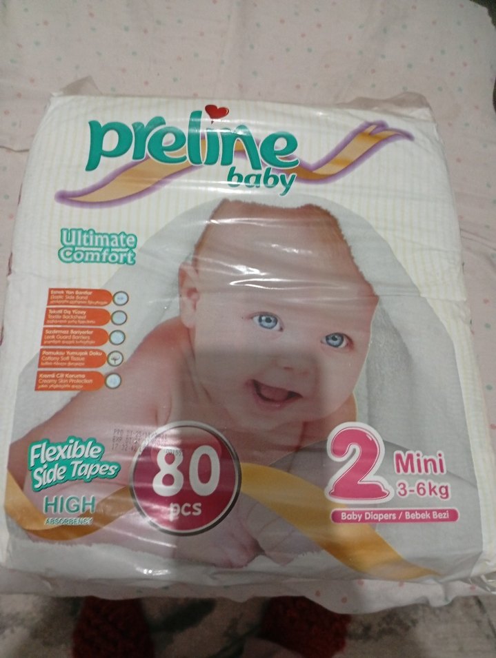 Preline bebek bezleri, 3-6 kg bebekler için Mini boyda, esnek yan bantlar ve üstün konfor sağlar. Pakette 80 adet bulunur.