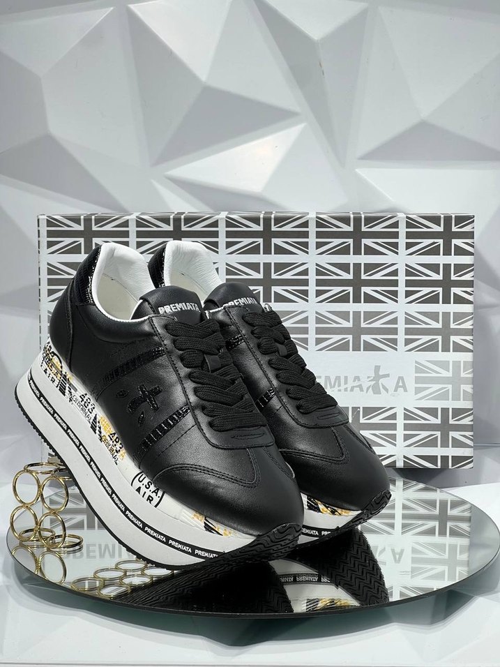 Siyah bağcıklı Kadın spor ayakkabısı, baskılı detaylar ve parlak yüzeye sahip, kauçuk tabanlıdır. Sokak stili ve spor için uygundur. Premiata Platform İtaly Women Imported & İthal 36 37 38 39 40