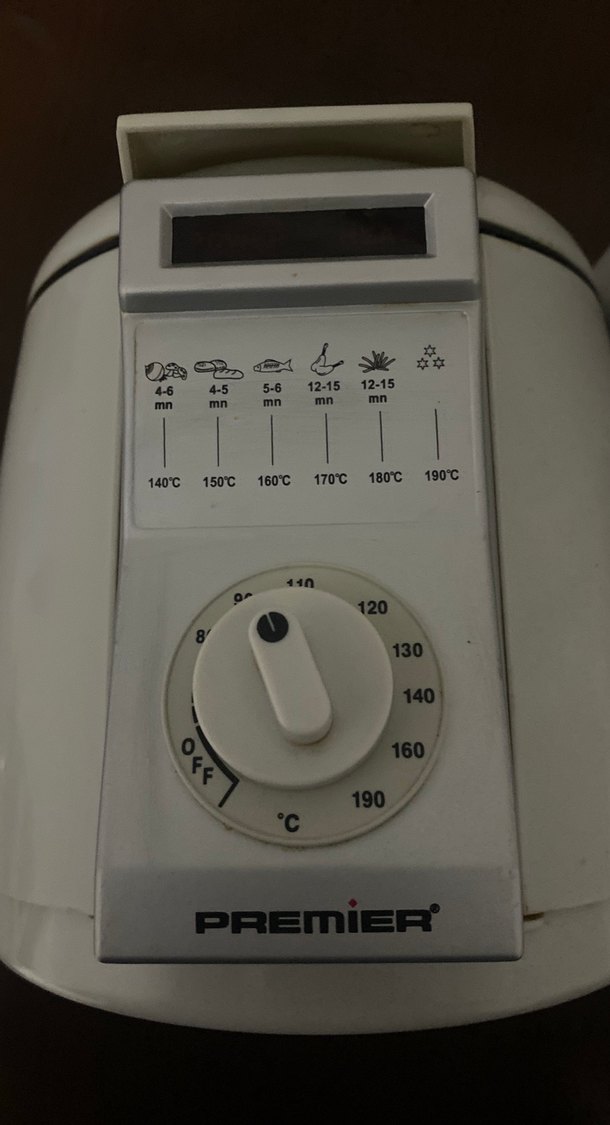 Premier marka gri termostatlı ısı kontrol cihazı, 40°C ile 190°C arasında sıcaklık ayarı ve hassas kontrol seçenekleri sunar. Fritöz, güzel sağlam patates kızartır.