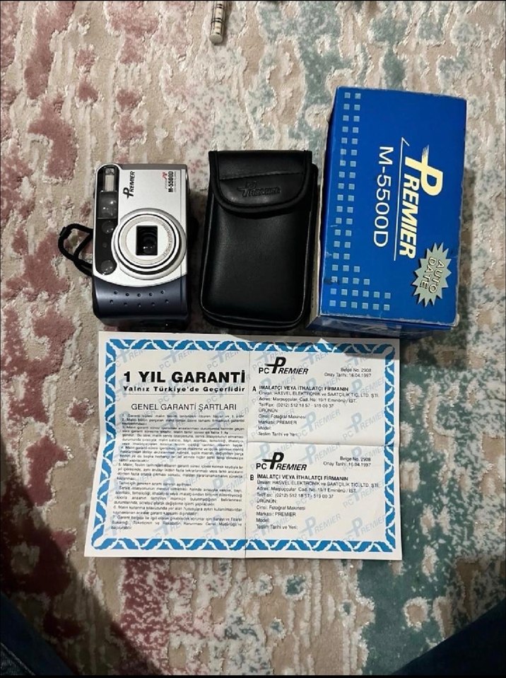 Mavi ve gri renkte PC Premier M-5500D filmli kamera, taşıma çantası, orijinal kutu ve 1 yıl garanti belgesi ile birlikte.