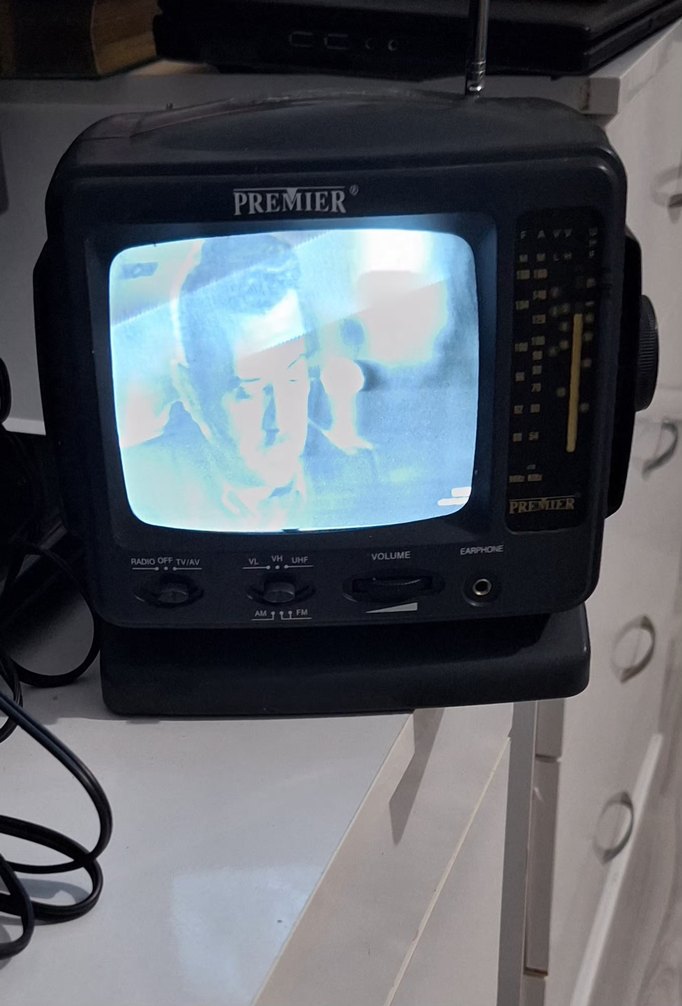 premier televizyon, radyo Ses kontrolü, ayar düğmeleri ve kulaklık girişi bulunan sarı Premier retro tasarımlı monitör. Küçük ekranda siyah beyaz görüntü gösterir. cihazda hiçbir sıkıntı yok çalışıyor Her şey orijinal