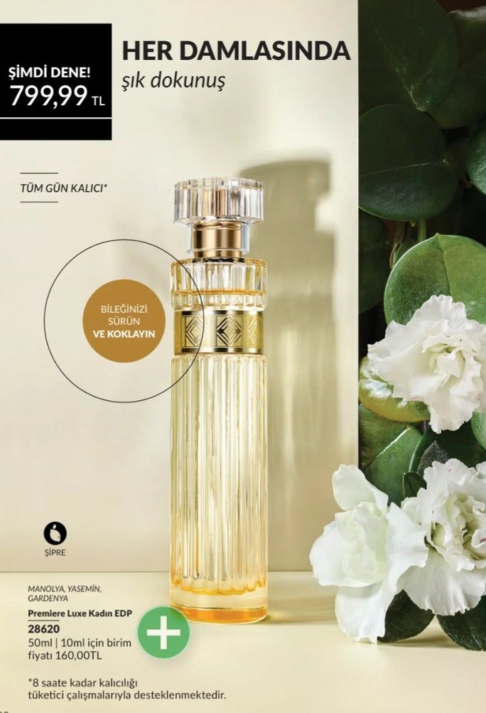 Premiere Luxe Kadın EDP, manolya, yasemin ve gardenya notalarıyla şık dokunuş sunar. 8 saate kadar kalıcıdır, 50ml şişede.