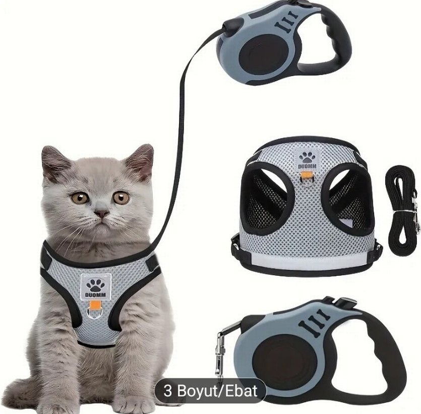 Gri renkli, nefes alabilen file kumaştan yapılmış kedi göğüs tasması ve otomatik geri çekilebilir kayış içerir. Rahat ve güvenli yürüyüş sağlar. “Güvenli Adımlar, Özgür Keşifler.” “Konforu Hisset, Kaçışı Unut.” “Şıklık, Güvenlik ve Özgürlük Bir Arada.” “Premium Konfor. Maksimum Güvenlik.” “Stil Sahibi Patiler İçin.” “Her Adımda Güven, Her Yürüyüşte Konfor.”