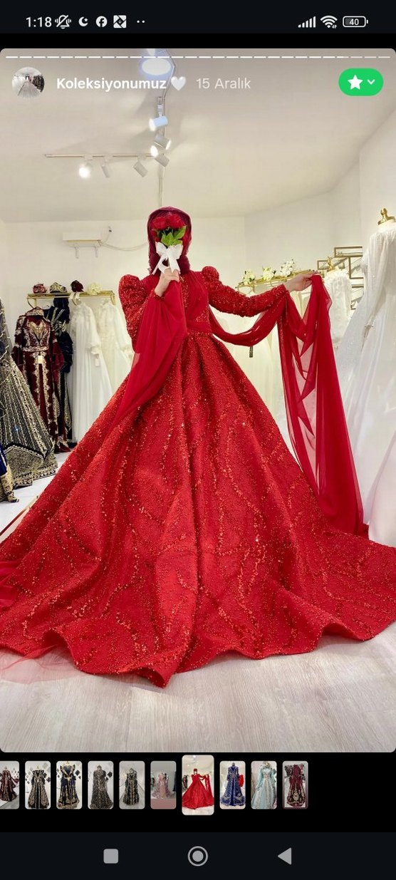 Kırmızı, parlak nakışlı kumaştan, drapeli, uzun kollu, hakim yakalı, klasik şıklıkta, oturan uzun ve kuyruklu abiye. (fiyat için iletişime geçiniz. temsili fiyattır.