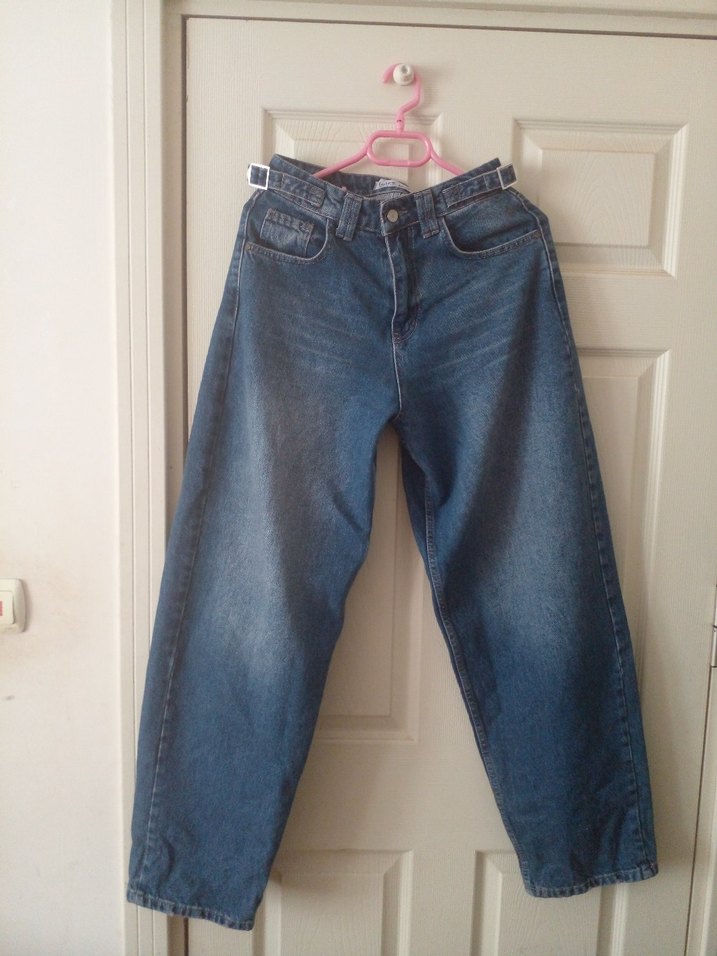 Kadınlar için mavi renkli, bol kesim kot pantolon. Tokalı bel detay ve normal uzunlukta, günlük rahat kullanım için uygundur. Hiç kullanılmadı.