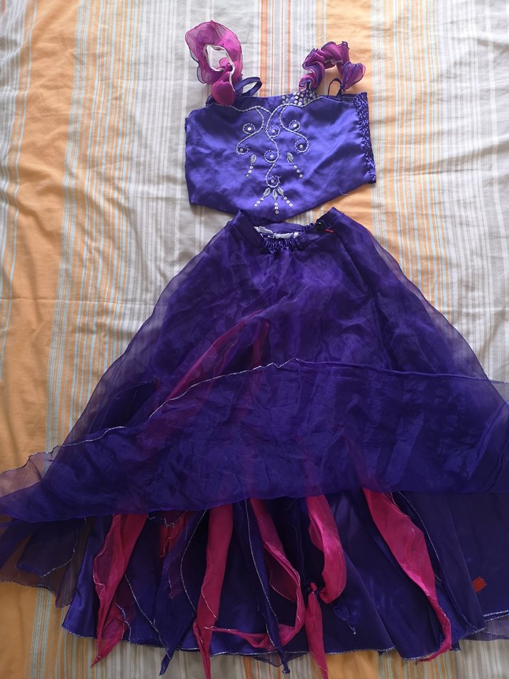 Koyu mor renkte, straplez yaka ve drapeli sentetik kumaştan yapılmış gotik tarzda, nakışlı ve askılı kollu, vücuda oturan çocuk kostümü. ✨