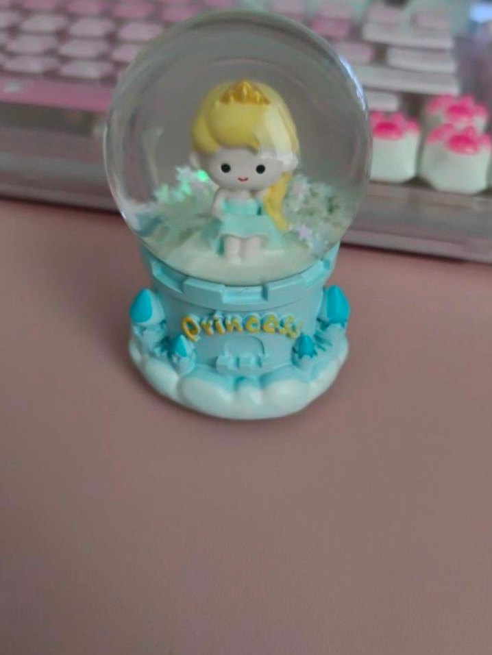 İçinde sevimli bir prenses figürü bulunan, tabanında kale detayları olan mavi pastel kar küresi. ❄️ ısıklı sorunsuzz