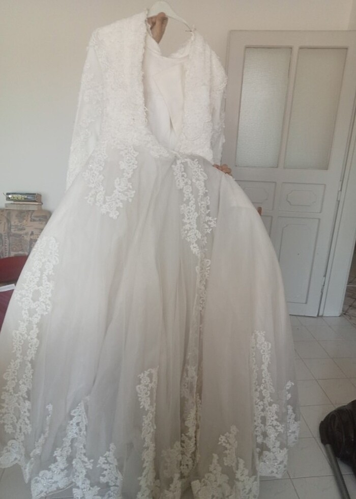 42 , 44 beden uyumlu. Arkası ipli fakat ipi kaybolmuş o yüzden fiyatı uygun tutuyorum. Kuru temizleme gerekiyor sadece. Tarlatani içinde var.