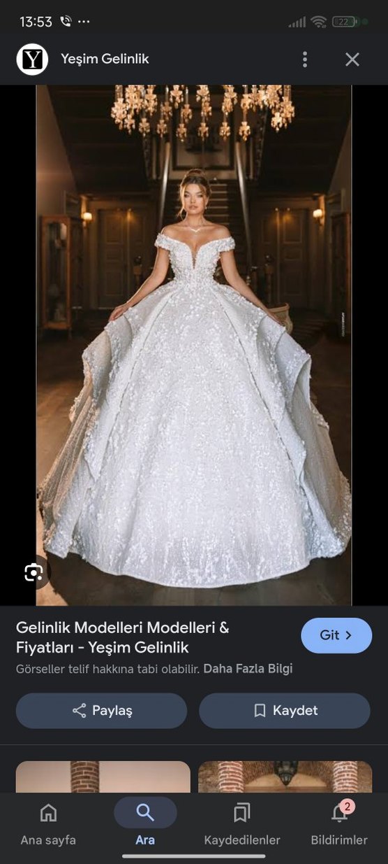 Parlak beyaz kumaştan, straplez, prenses kesim, uzun boylu, kolsuz ve modern klasik tarzda, vücuda oturan gelinlik. Görkemli bir düğün için ideal.