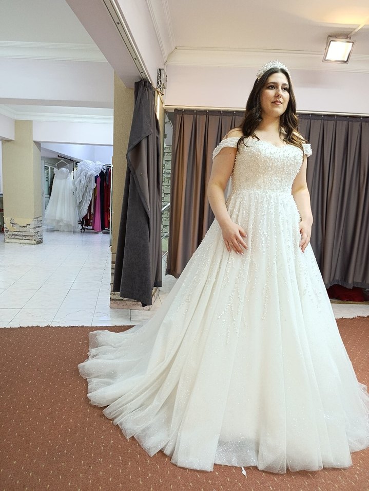 Uzun, beyaz gelinlik; straplez yaka, kısa kollu ve bol kesim. Klasik şıklık ve görkemli tarzı bir arada sunar. 44/46/48 bedene uygun sırtı ipli