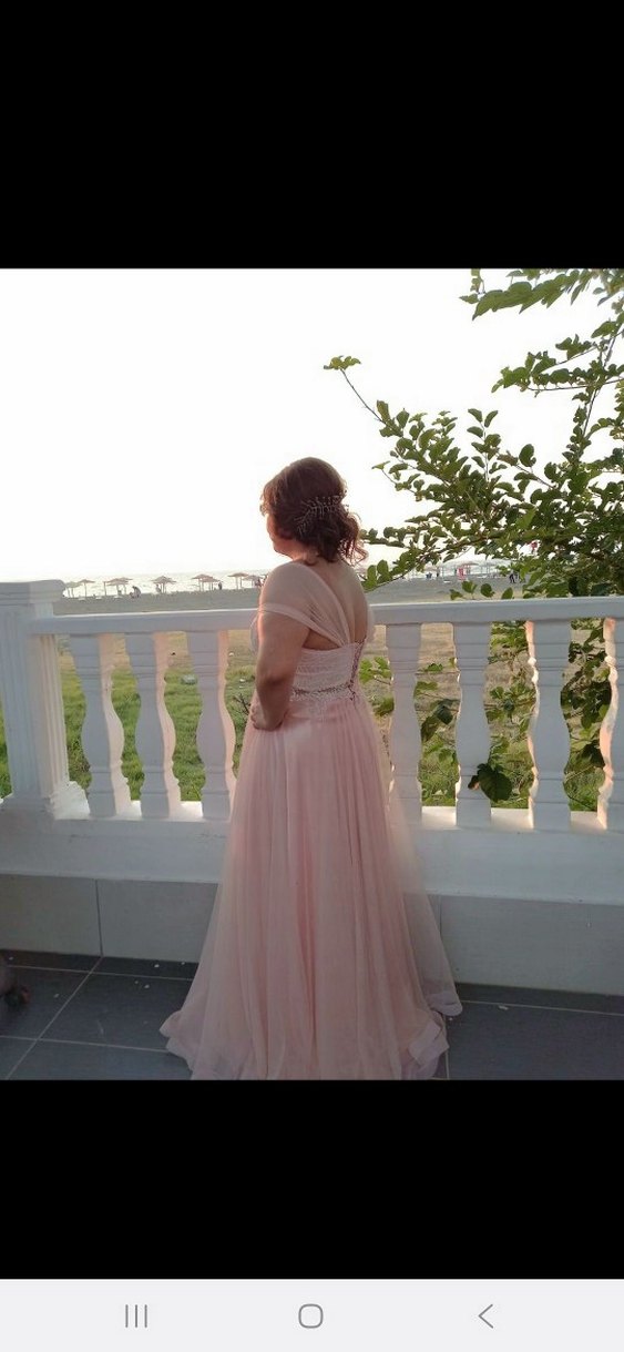 Uzun pembe abiye elbise. prenses kol ve bağcıklı sırt dekoltesiyle tam bir prenses model nişan elbisesi