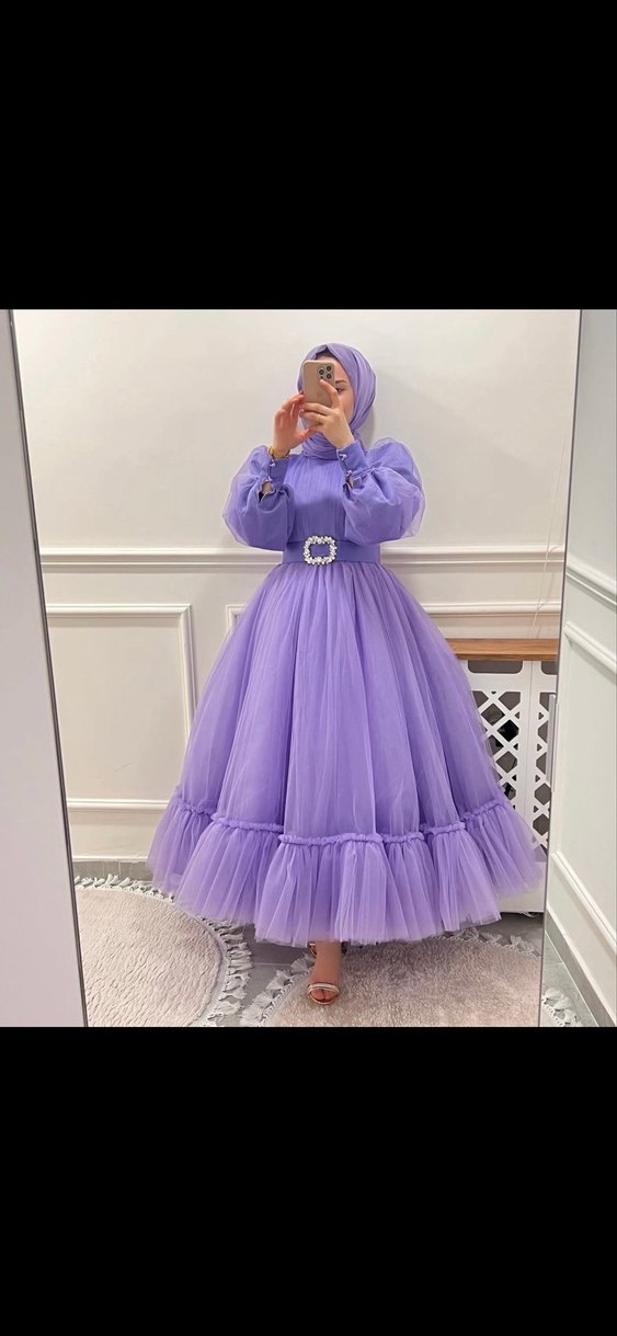 Lila uzun abiye elbise, bol kesim ve etek kısmında fırfır detaylara sahiptir. Yüksek yakalı ve balon kolludur, düğün için uygundur 36/38/40 bedene kadar uygundur arkası iplidir kemerli ve aynı tonda şalı ile gönderilmektedir.