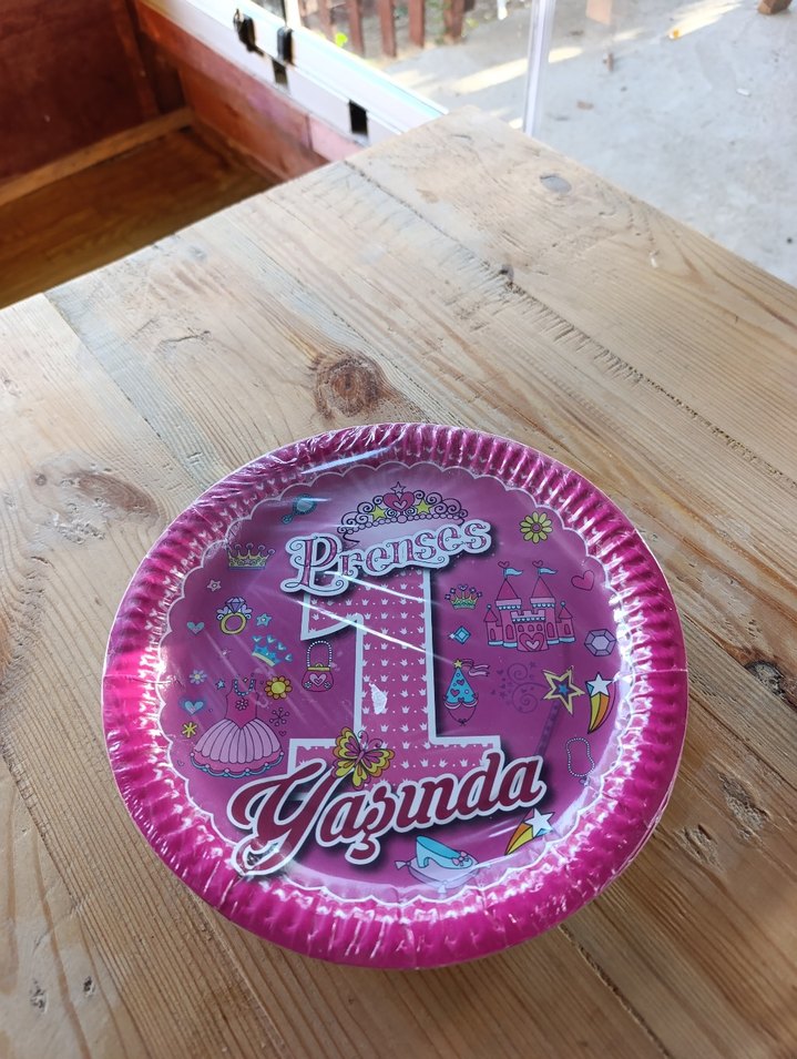 Renkli pembe kağıt tabaklar üzerinde "Prenses 1 Yaşında" yazısı bulunan doğum günü tabakları.