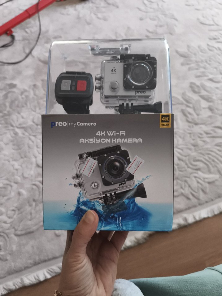 Preo aksiyon kamerası 4K video ve Wi-Fi bağlantısı sunar. Su geçirmez kılıf ve uzaktan kumanda ile birlikte gelir. Beyaz ve gri renklerde. sıfır ürün