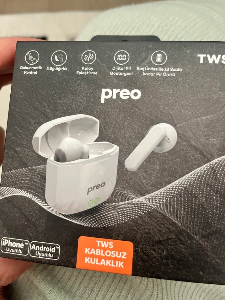 Preo TWS kablosuz kulaklık, dokunmatik kontrol, 3.8g hafiflik, kolay eşleştirme, dijital pil göstergesi ve şarj kutusuyla 18 saate kadar kullanım sunar. Android ve iPhone uyumlu.