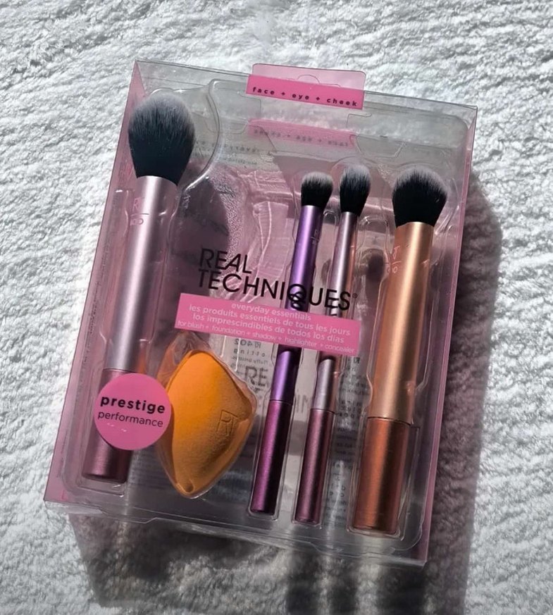 Prestige Real Techniques makyaj fırça seti, yüz, göz ve yanaklar için çeşitli açık pembe fırçalar ve sünger içerir. ️