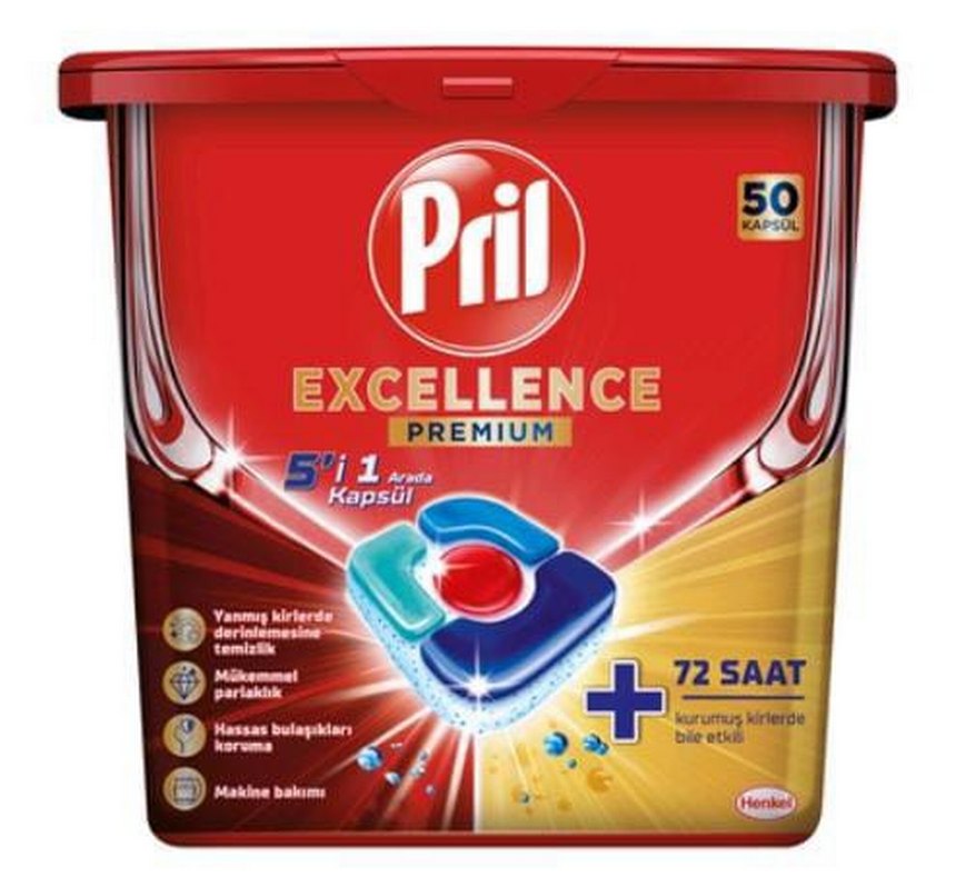 Parlak kırmızı ambalajda Pril Excellence kapsülleri, yanmış kirlerde derinlemesine temizlik, mükemmel parlaklık ve hassas bulaşık koruması sağlar. Makine bakımı için uygun ve 72 saate kadar kurumuş kirlerde etkilidir.