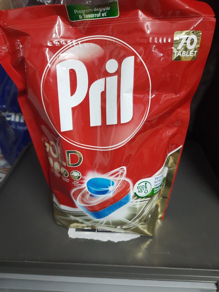 Pril kırmızı bulaşık tabletleri, 70'li pakette sunulur ve etkili temizlik için ekolojik özelliklere sahiptir.