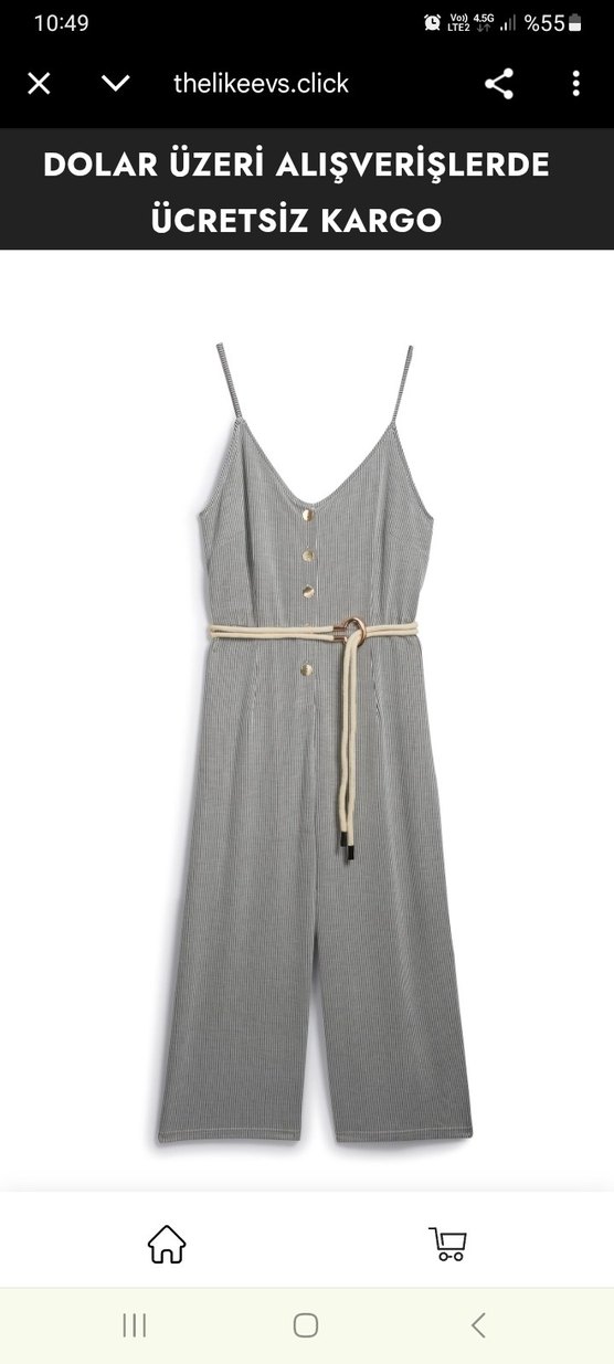 Gri çizgili, askılı, V yakalı ve kemerli bel detaylı bol kesim kadın tulumu. Önü düğmeli ve yumuşak sentetik kumaştan üretilmiştir. Günlük kullanıma uygun. esnektir. ipi kısaltılmıştır. tülerme mevcuttur