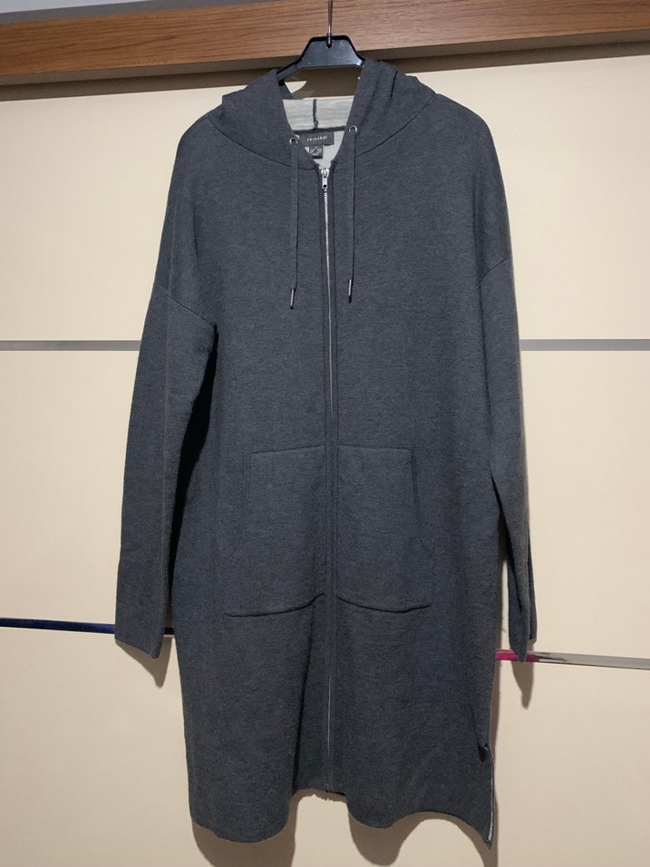 Primark marka gri renkte, yumuşak kumaştan, bol kesim ve uzun kollu kadın hırka. Fermuarlı ve kapüşonlu, gündelik kullanıma uygun. Birkaç kez giyildi bir sorunu yoktur.