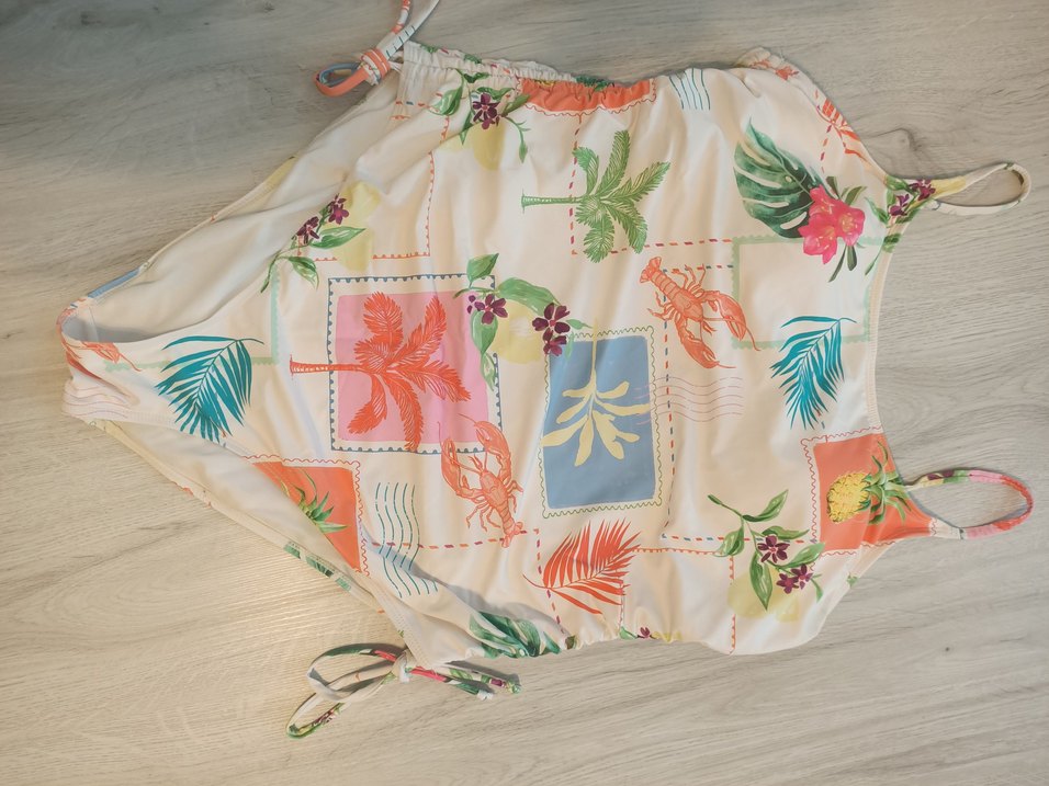İngiltere'den, kusursuz.Bohem tarzı, çok renkli pastel desenli, uzun ve bol kesim kadına özel mayo, plajda rahat kullanım için askılı detaylara sahip.