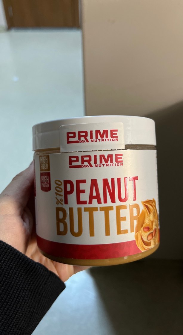 Prime Nutrition markalı, yüksek lif içeren parlak etiketli beyaz ambalajda fıstık ezmesi. bi kasık kullanıldı o da tadına bakmak için