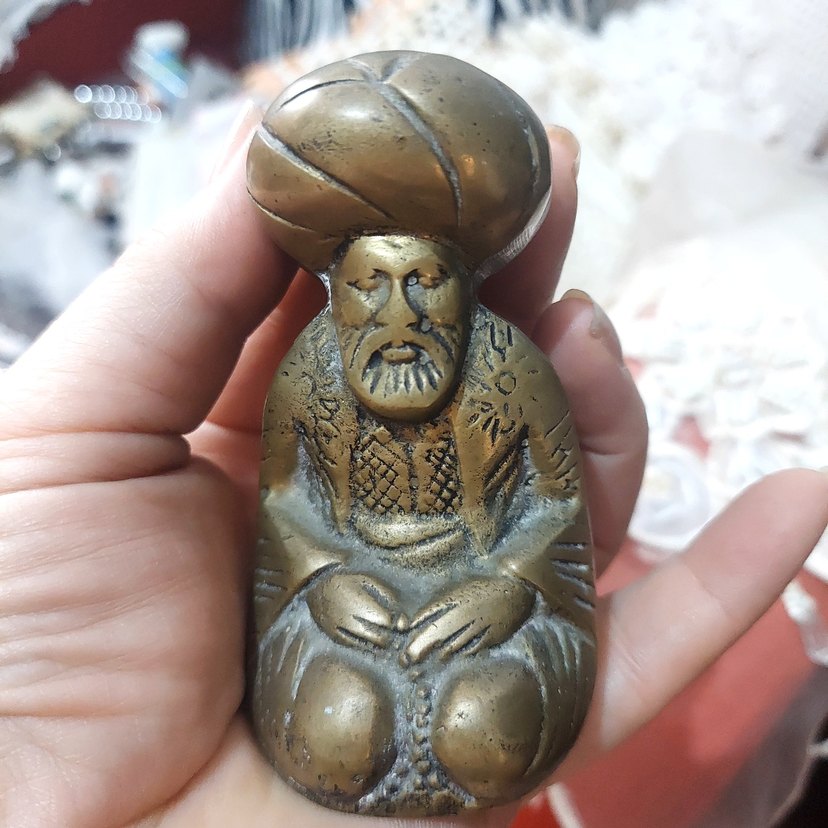 Eski princ agir biblo. geleneksel kıyafetli ve sarıklı oturur pozisyonda bir adam figürini, detaylı oyma desenlere sahip. ♂️büfede durdu