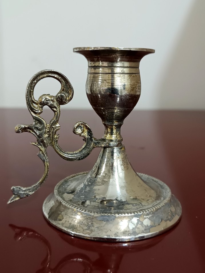 Prinç şamdan üstü gümüş kaplama çok eski ürünlerdendir. Sadece kullanılmadığı için alan kişi için dokusuna zarar vermeden prille temizlenmiş streçle dolaba konmuştur. Fotoğrafta gözüktügü gibidir .Yükseklik 8.5 iç çap 7 cm En uygun Kargolu fiyat yazıldığından teklife kapalıdır. Parlak altın renkli, süslü saplı ve yuvarlak tabanlı metal mumluk. ️