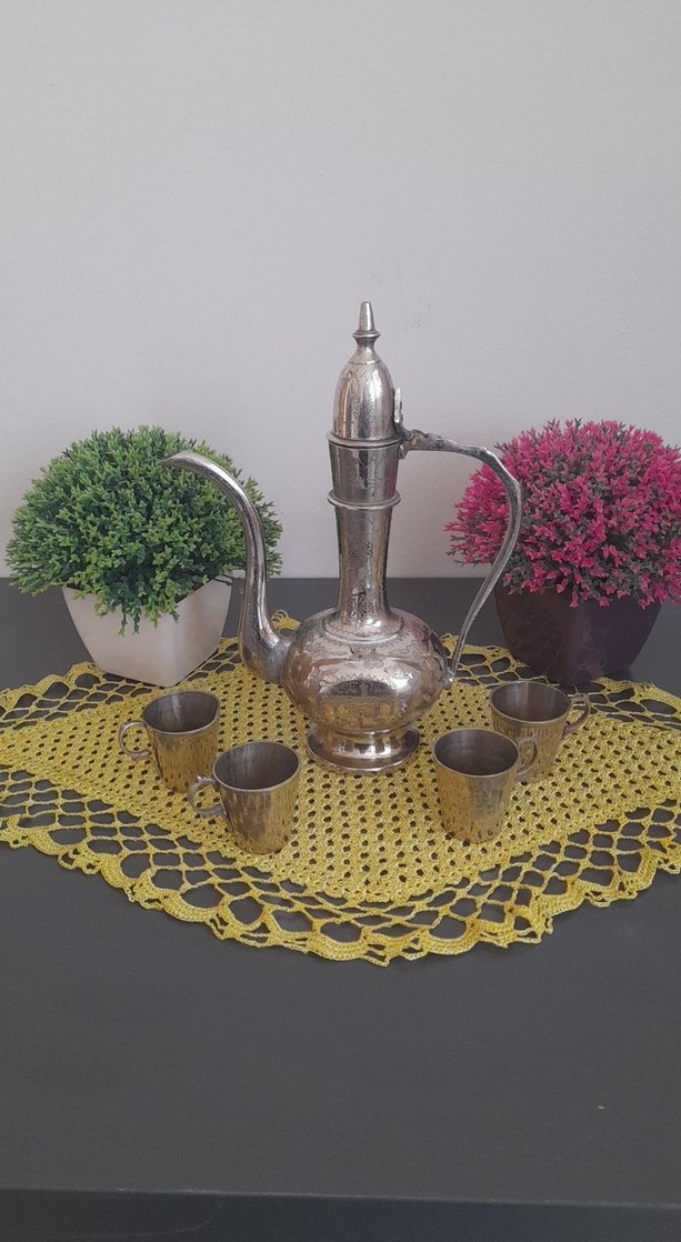 Uzun, zarif kulplu ve ince ağızlı altın renkli çaydanlık seti, dört küçük bardakla birlikte sunulmuştur. ibrigi kaynak yapılmıştır.kapagida sabit degil resimde mevcut son görseldeki büyük prinç bardak hediyesidir alana hayırlı olsun