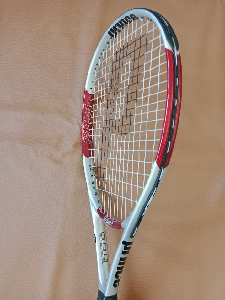 Beyaz renkli tenis raketi, kırmızı ve siyah detaylarla renkli tasarıma sahip, sağlam çerçeve ve sıkı gerilmiş tellerle hassas oyun sağlar. Prince air O score ti 27 inç yetişkin raketidir kafa boyutu 110 grip L3 ağırlık 275 gram