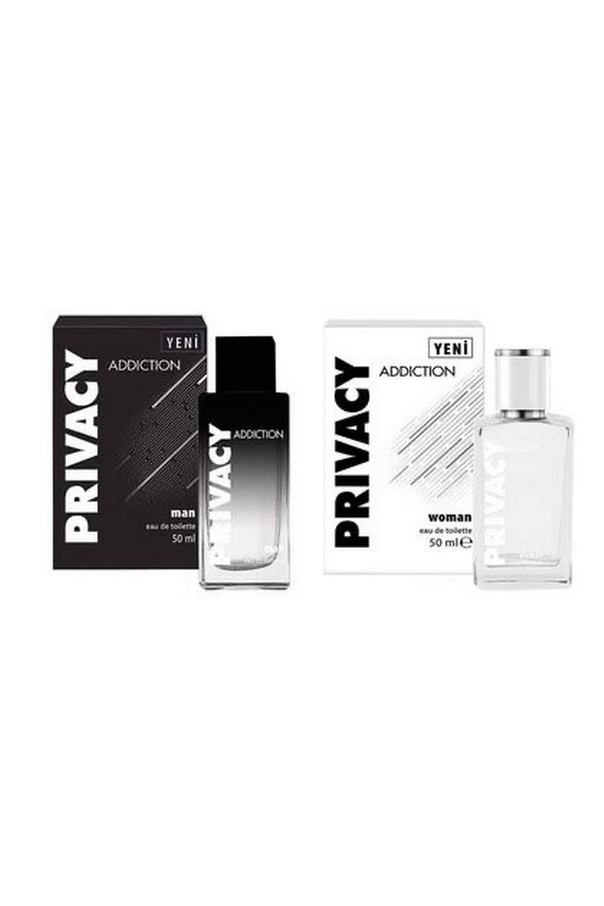 Minimalist ve çağdaş tasarıma sahip Privacy Addiction erkek parfümü, 50 ml siyah ve gri şişede, "ADDICTION" ve "YENİ" yazılıdır.