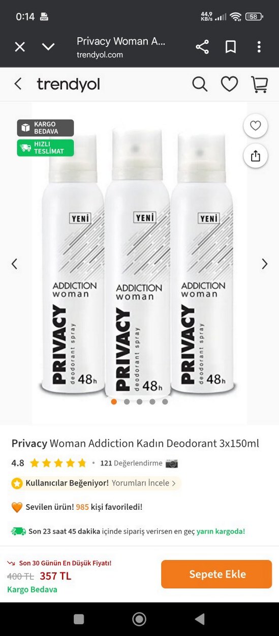 Privacy Woman Addiction kadın deodorant 48 saat koruma sağlar. Fotoğrafdaki 150ml benim göndereceğim 200 ml dir açılmadı denenmedi sıfır ürün.