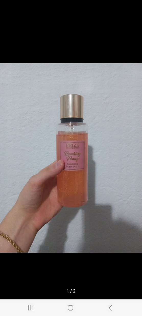 PRIZE markalı parfümlü vücut spreyi, ışıltılı ve şakayık çiçeği kokulu, cildi ferahlatır ve hafifçe kokulandırır. kullanım durumu görseldeki gibidir