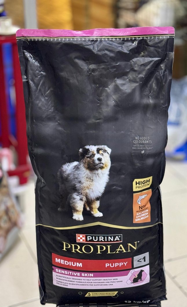 12 kg Skt:01/2027 Purina Pro Plan orta ırk yavru köpekler için yüksek proteinli, somonlu hassas cilt destekli mama. Renklendirici içermez.